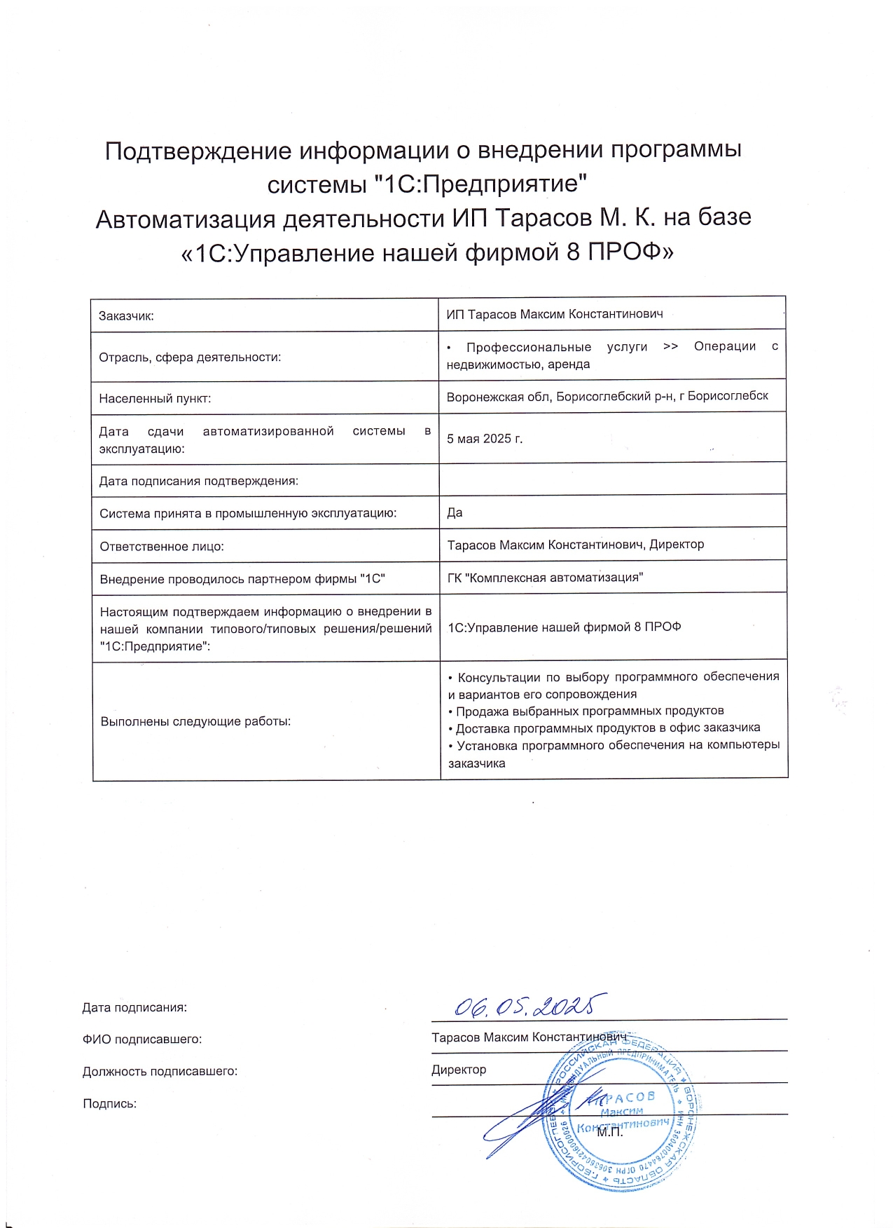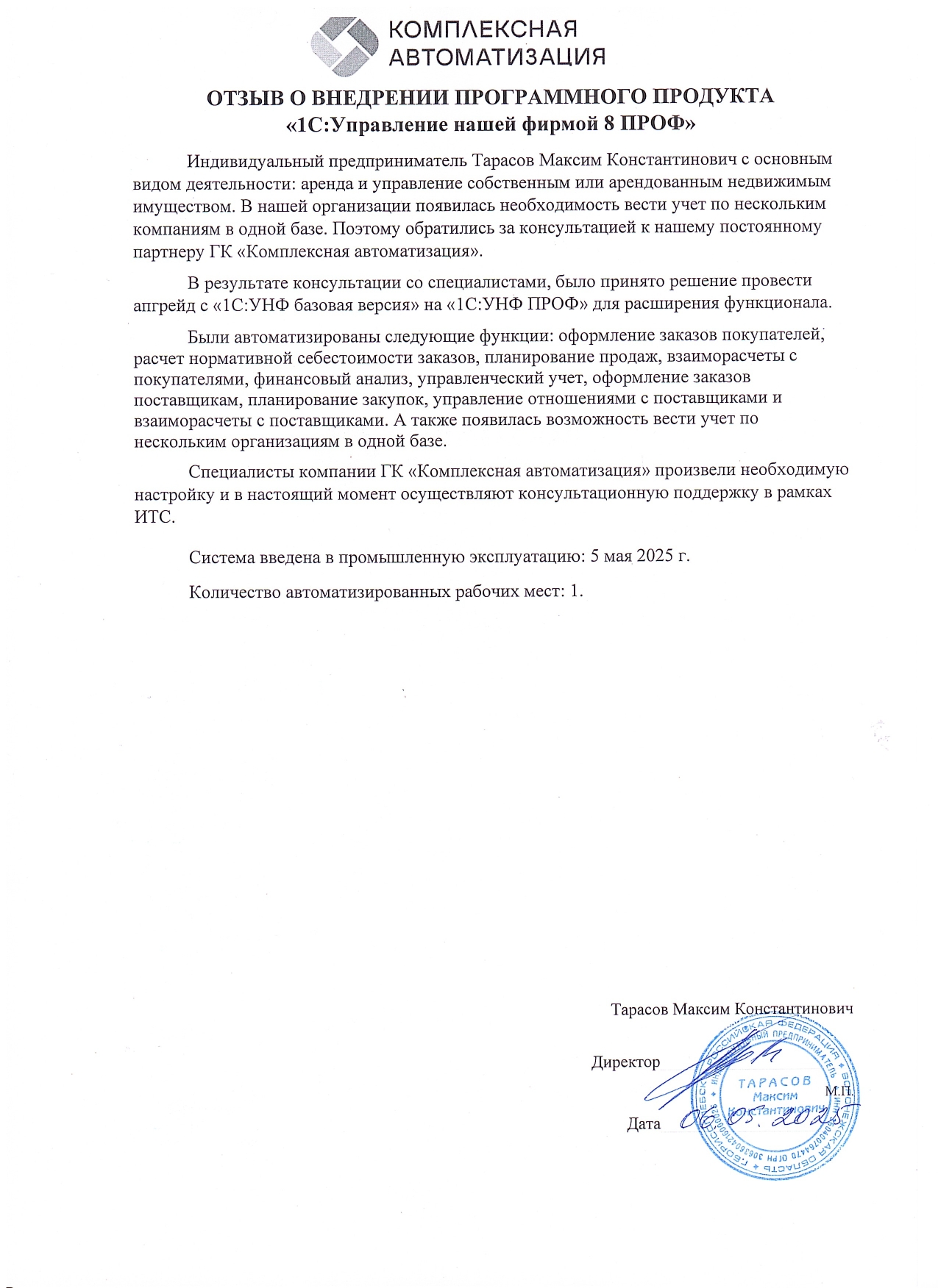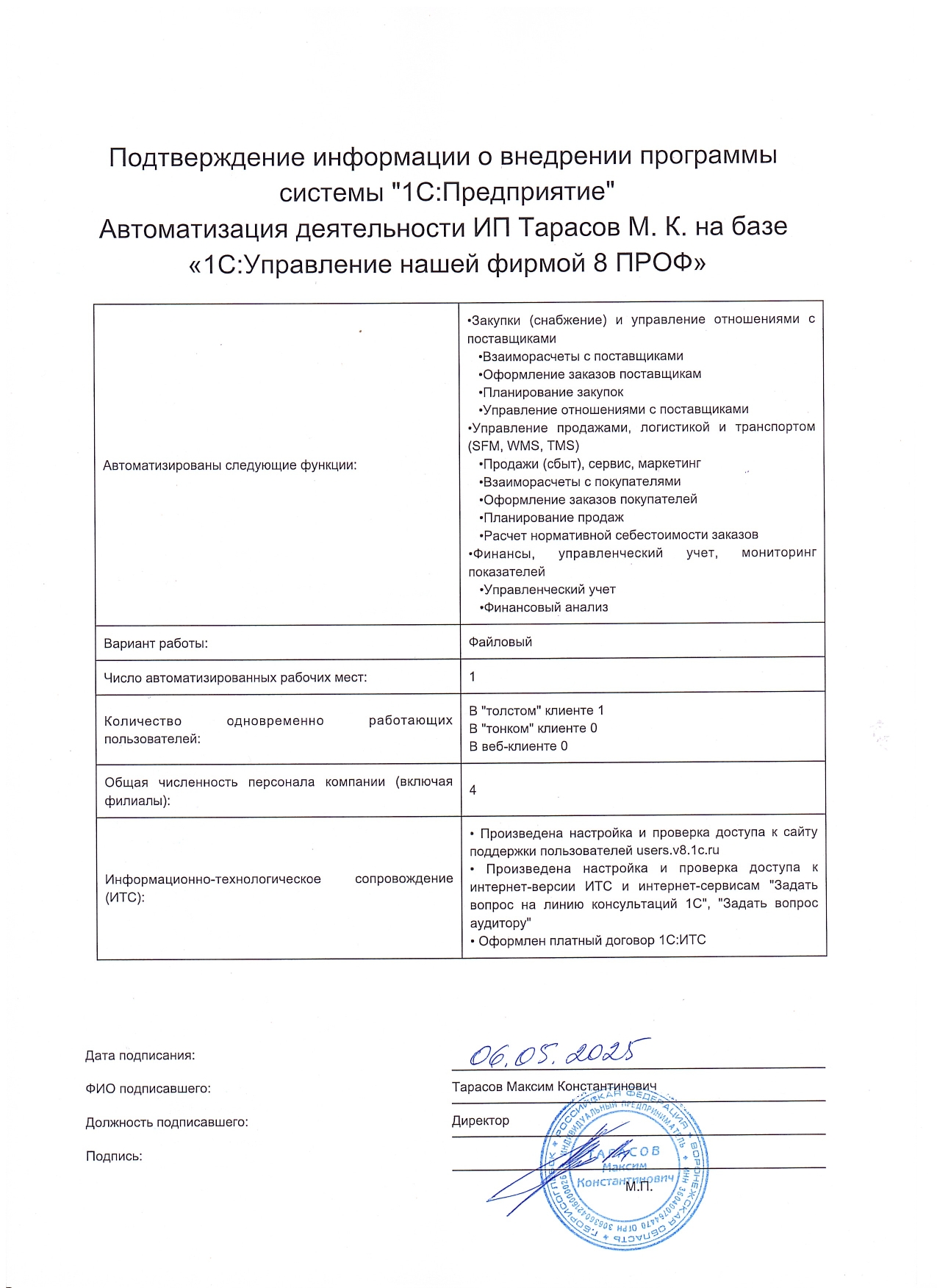 Автоматизация деятельности у ИП Тарасова М. К. на базе «1С:Управление нашей фирмой 8 ПРОФ»-
